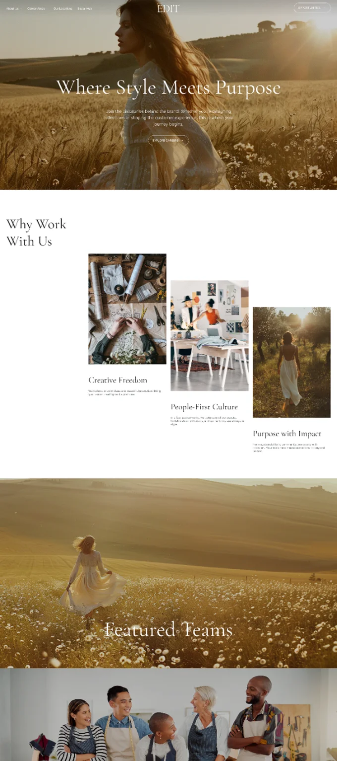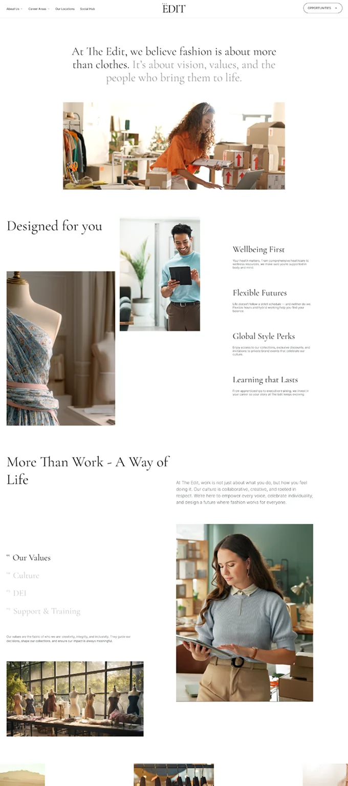 A refined and image-led careers experience for a global fashion brand. The Edit brings together editorial design, storytelling, and effortless navigation to create a careers site that feels like an extension of the brand itself - modern, inclusive, and deeply human. Designed to inspire connection and showcase culture through striking imagery, clean layouts, and aspirational tone.