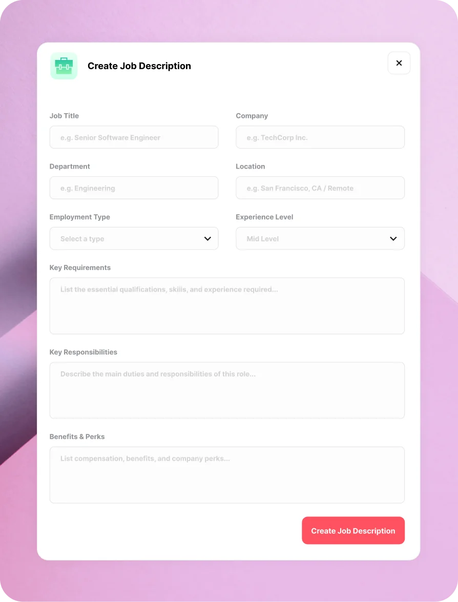 Generate complete, on-brand job descriptions from a short prompt - consistent quality across every role, every brand, every hire.