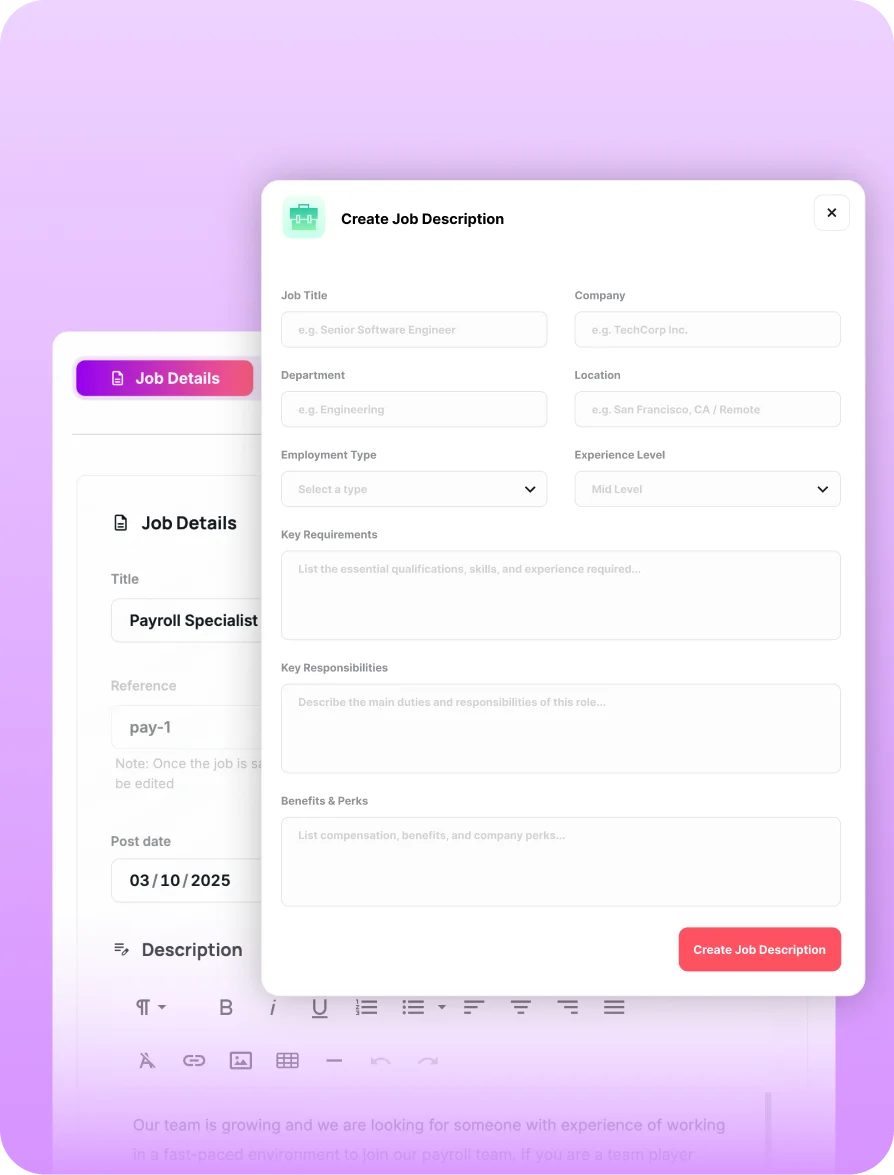 Generate complete, on-brand job descriptions from a short prompt. The AI Job Spec Helper gets roles ready to post quickly, with consistent quality every time.