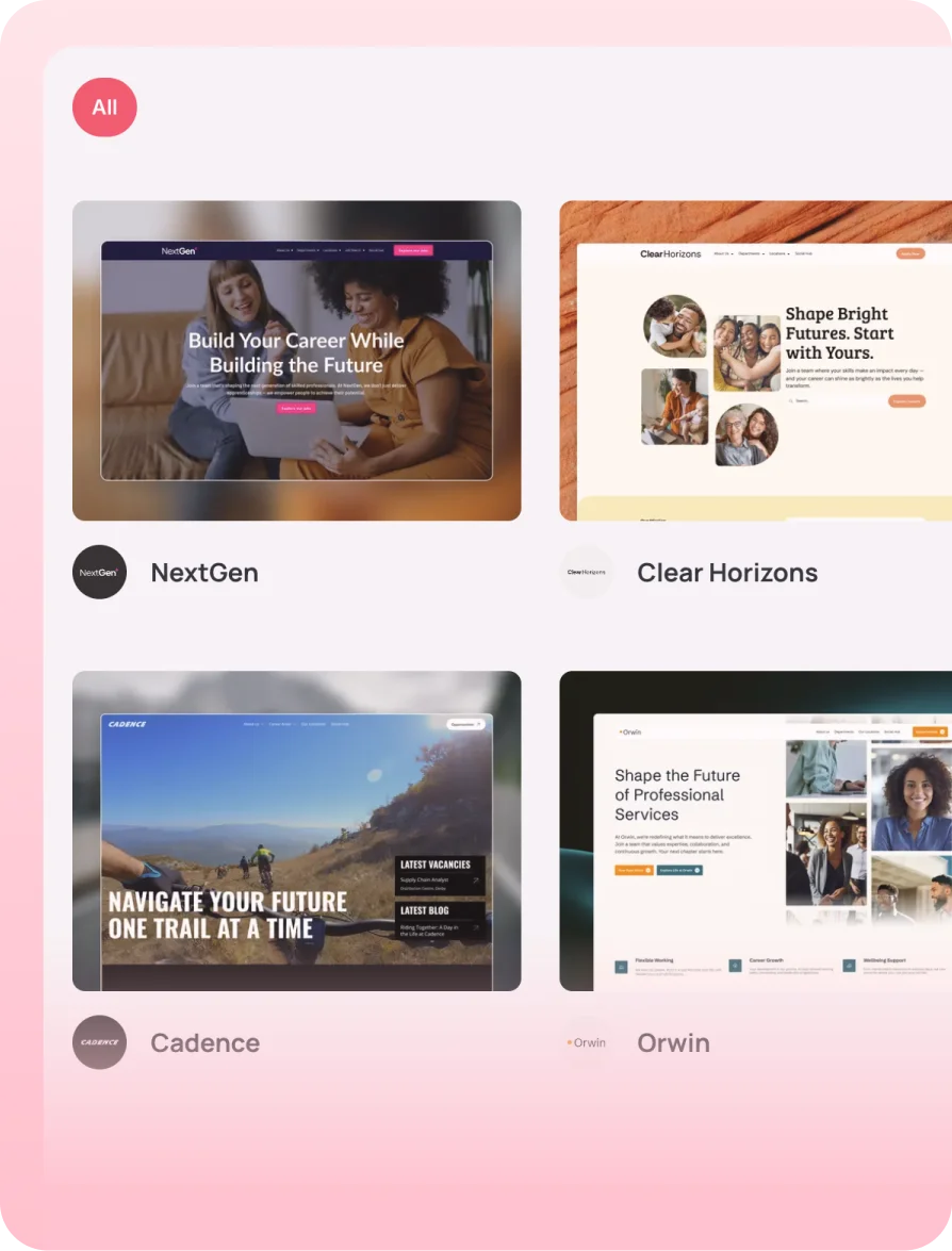 A library of professionally designed hiring website themes - ready to launch quickly, and adaptable to your brand guidelines. Add team pages, department sections, and culture content following our best practice-designed themes.