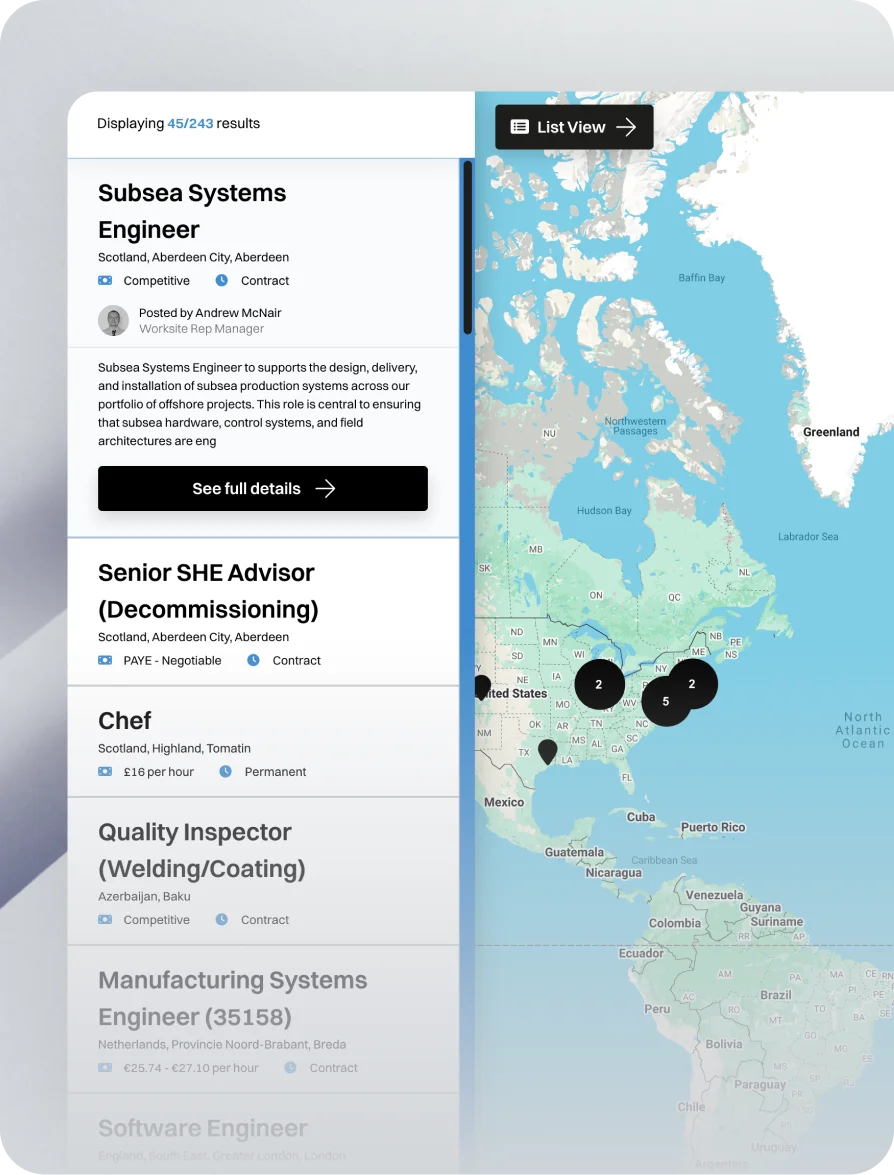 Candidates can browse open roles visually on an interactive map - seeing exactly where opportunities are based, previewing key details, and clicking through to the full spec when something looks right. Location becomes something to explore, not just filter.